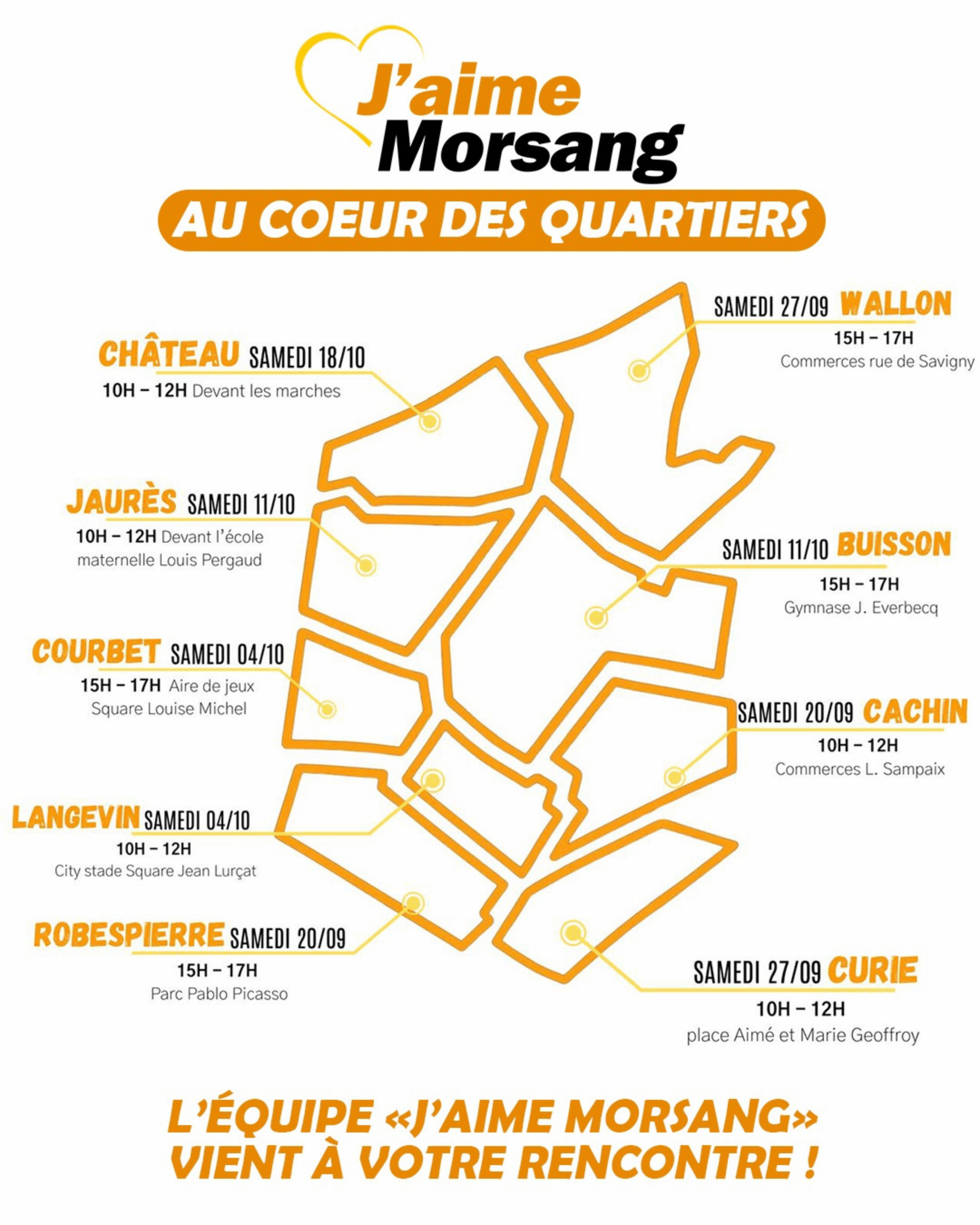 Que ce soit lors des concertations citoyennes ou en porte à porte, l’équipe de j’aime Morsang vient à votre rencontre pour échanger et vous écouter.